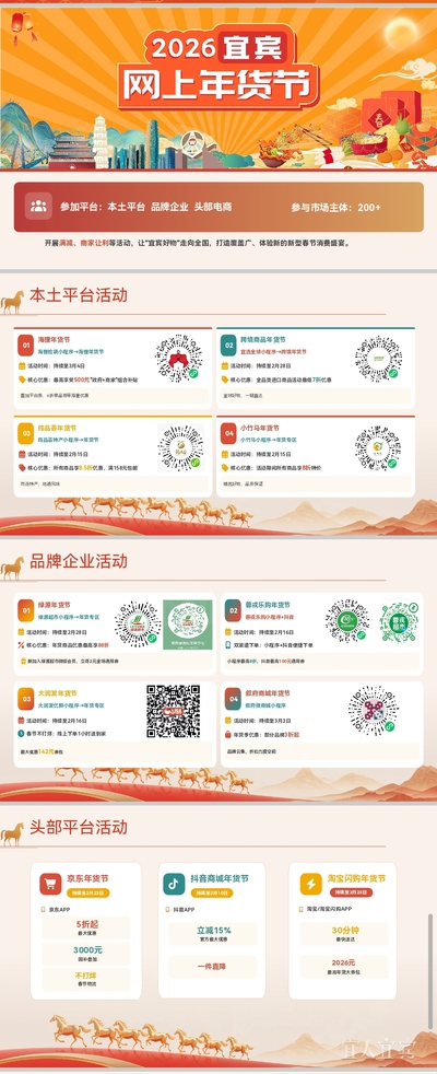 据了解,为深入贯彻落实中、省、市提振消费决策部署,营造新春节庆氛围,激活春节消费市场,市商务局组织各县(区)电商平台、直播基地以及品牌电商企业等200余户企业,围绕“年货、年味”元素,在多家平台统一使用“2026宜宾网上年货节”标识,开展满减、商家让利等活动,让“宜宾好物”走向全国,打造覆盖广、体验新的新型春节消费盛宴,丰富春节期间广大市民的消费供给。